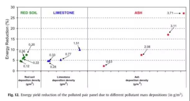 希臘一個(gè)科研團(tuán)隊(duì)曾經(jīng)做過比較系統(tǒng)的研究,比較了同樣覆蓋條件下土壤、石灰、灰塵沉積對(duì)發(fā)電性能的影響,其中灰塵(也就是空氣污染的主要產(chǎn)物)的影響是最大的,當(dāng)集灰密度達(dá)到3克每平方米時(shí),發(fā)電量可以降低15%以上。原因大致在于,灰塵的顏色深,顆粒小,透光性差,薄薄一層的覆蓋就透不了多少光了。
