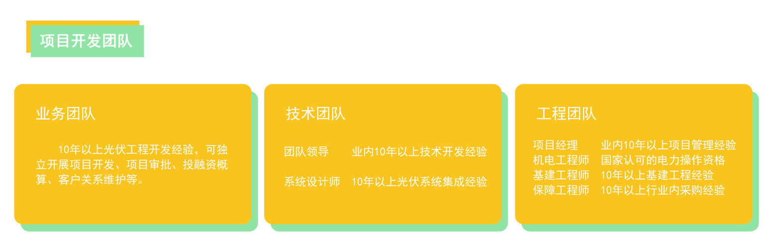 獨特的時代背景,賦予我們開發、發展綠色能源的使命,造就我們誠信、專注、追求效率、保質保量、不斷創新的企業形象。公司經營范圍涵蓋:太陽能發電系統的開發、咨詢、設計、施工、監理以及工程總承包。業務主要有太陽能發電系統設備的設計、開發、采購、成套、安裝、調試及太陽能發電系統工程項目的建設及運營等。我們建立并不斷完善一系列業務流程及管理制度,主要流程與制度:前期的策劃、方案選擇、可行性研究、工程設計、設備采購、項目管理、安裝施工、試調與系統維護等。